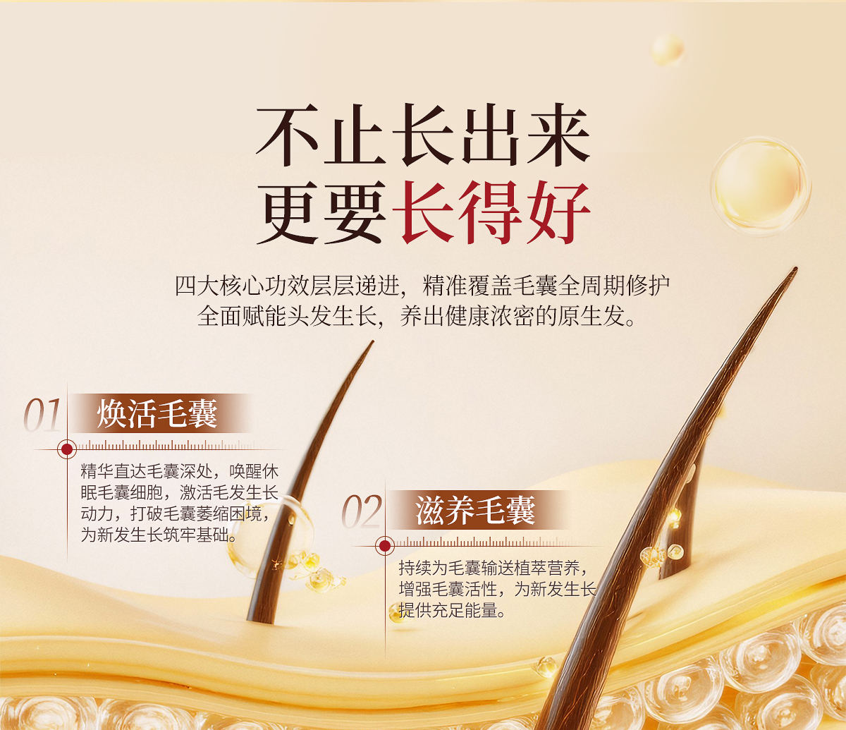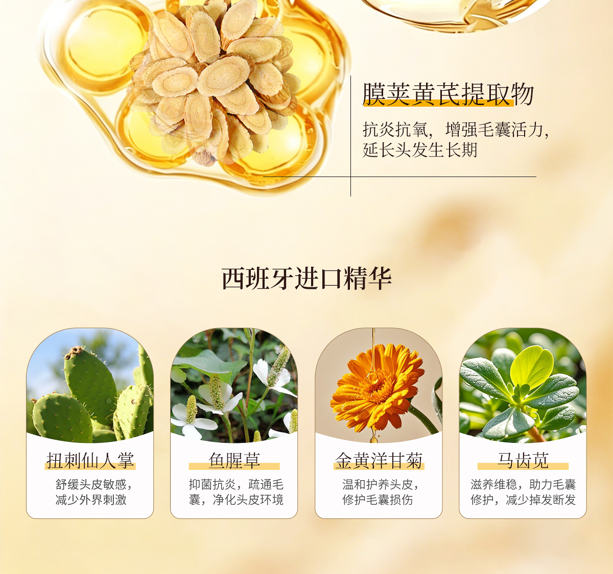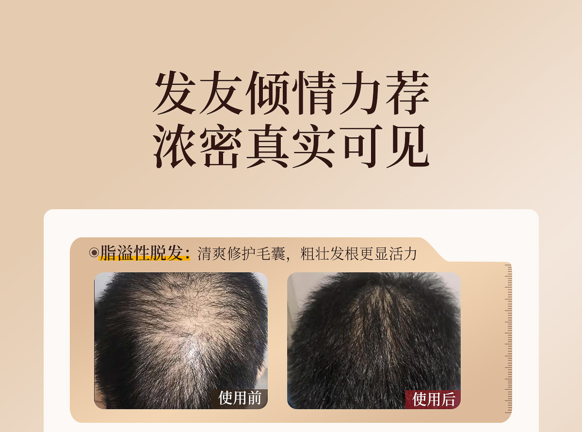 适宜人群:各种类型脱发人群。 作 用:柔顺护发配方,滋养修护发丝,改善分叉、受损秀发,让秀发丝柔盈亮油韧性